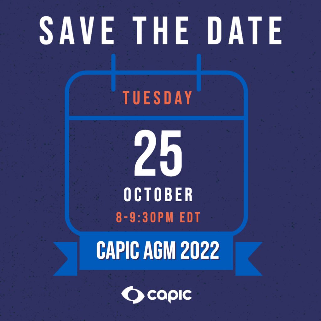 The Annual General Meeting of CAPIC will be held this year on Tuesday, October 25th, 2022 at 8:00PM ET via video conference. Video conference login information will be sent to CAPIC members who RSVP prior to the meeting.