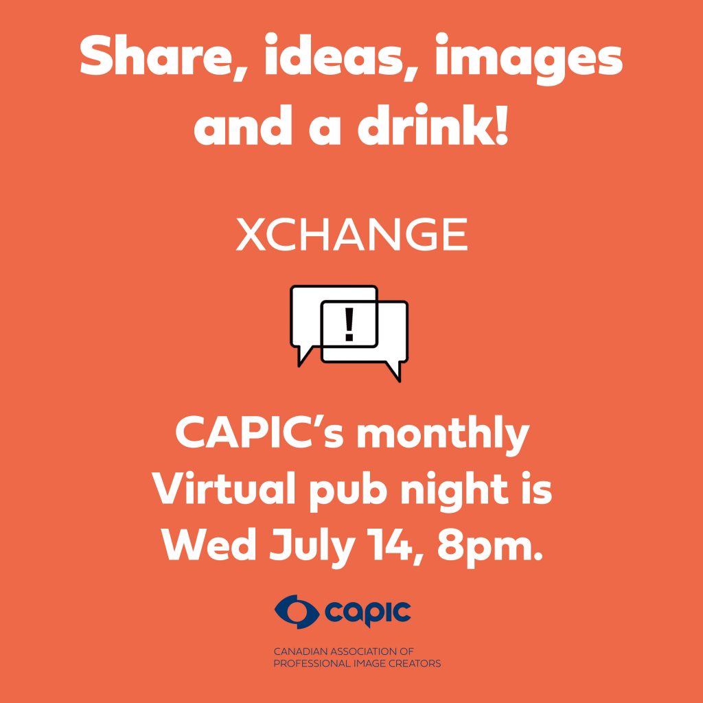 The CAPIC Toronto Chapter is delighted to welcome you to its monthly Virtual Xchange and Pub Night! This month, the event will be held Wednesday, July 14th, 2021 at 8pm EDT. The event is held via Zoom and is open to the public. Join us for an evening of networking with other professional image creators. All CAPIC members and non-members from across Canada are welcome to attend! Invite your friends! Please see below for calendar and Zoom links.