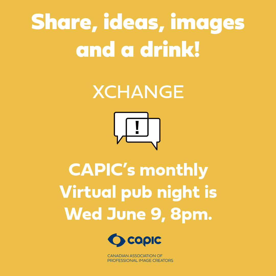 The CAPIC Toronto Chapter is delighted to welcome you to its monthly Virtual Xchange and Pub Night! This month, the event will be held Wednesday, June 9th, 2021 at 8pm EDT. The event is held via Zoom and is open to the public. Join us for an evening of networking with other professional image creators. All CAPIC members and non-members from across Canada are welcome to attend! Invite your friends! Please see below for calendar and Zoom links.