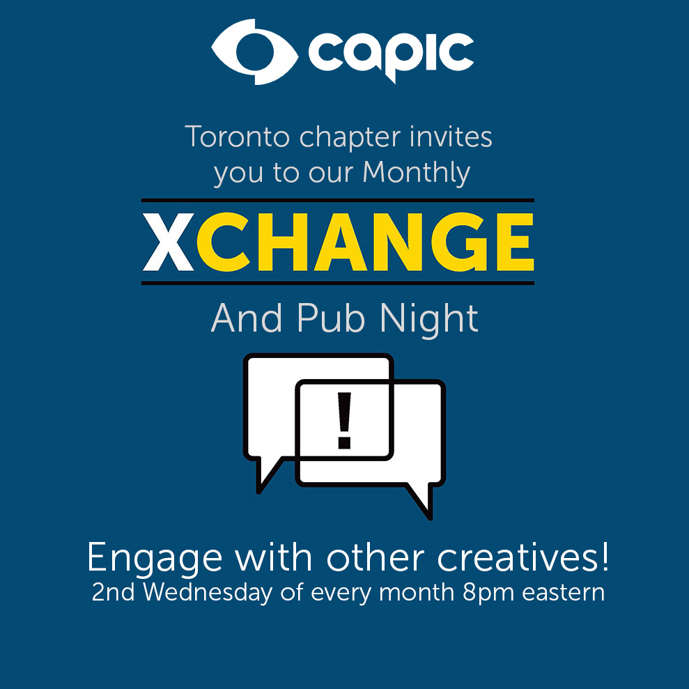 The CAPIC Toronto Chapter is delighted to welcome you to the monthly Virtual Xchange and Pub Night! This month, the event will be held Wednesday, March 10th, 2021 at 8pm EST. The event is held via Zoom and is open to the public. Join us for an evening of networking with other professional image creators. All CAPIC members from across Canada are welcome to attend! Please see below for calendar and Zoom links.