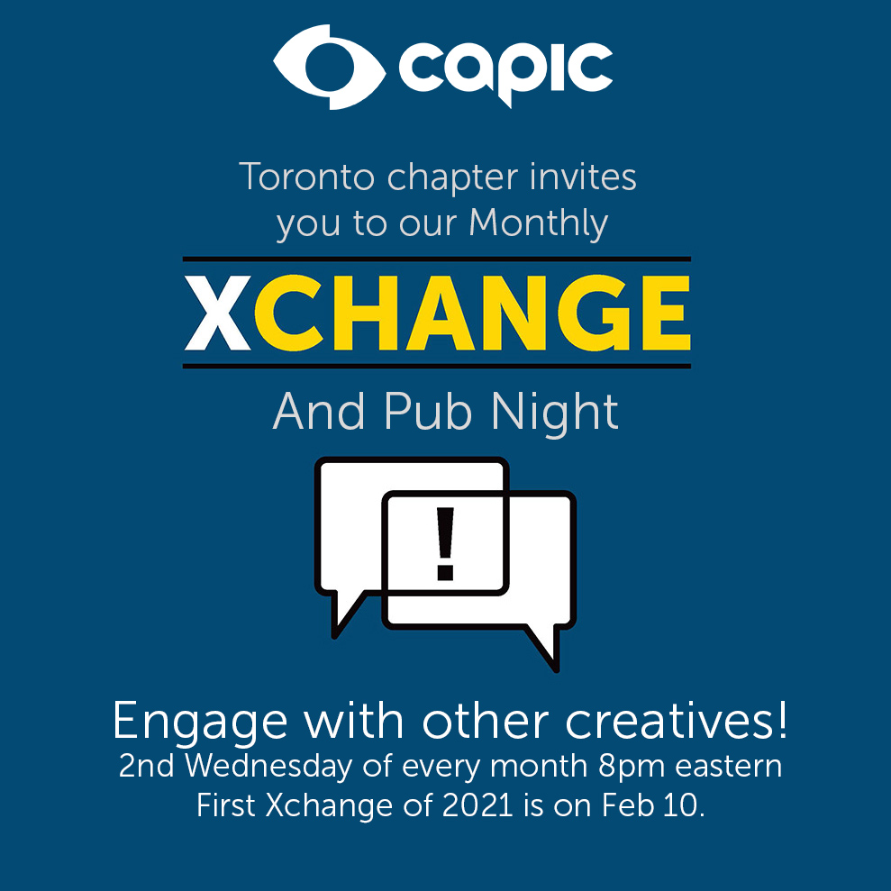 The CAPIC Toronto Chapter is delighted to announce the first ever virtual Xchange & Pub Night! This social event will be held monthly via Zoom, with the first happening Wednesday, February 10th, 2021 at 8pm EST. Join us for an evening of networking with other professional image creators. All CAPIC members are welcome to attend!
